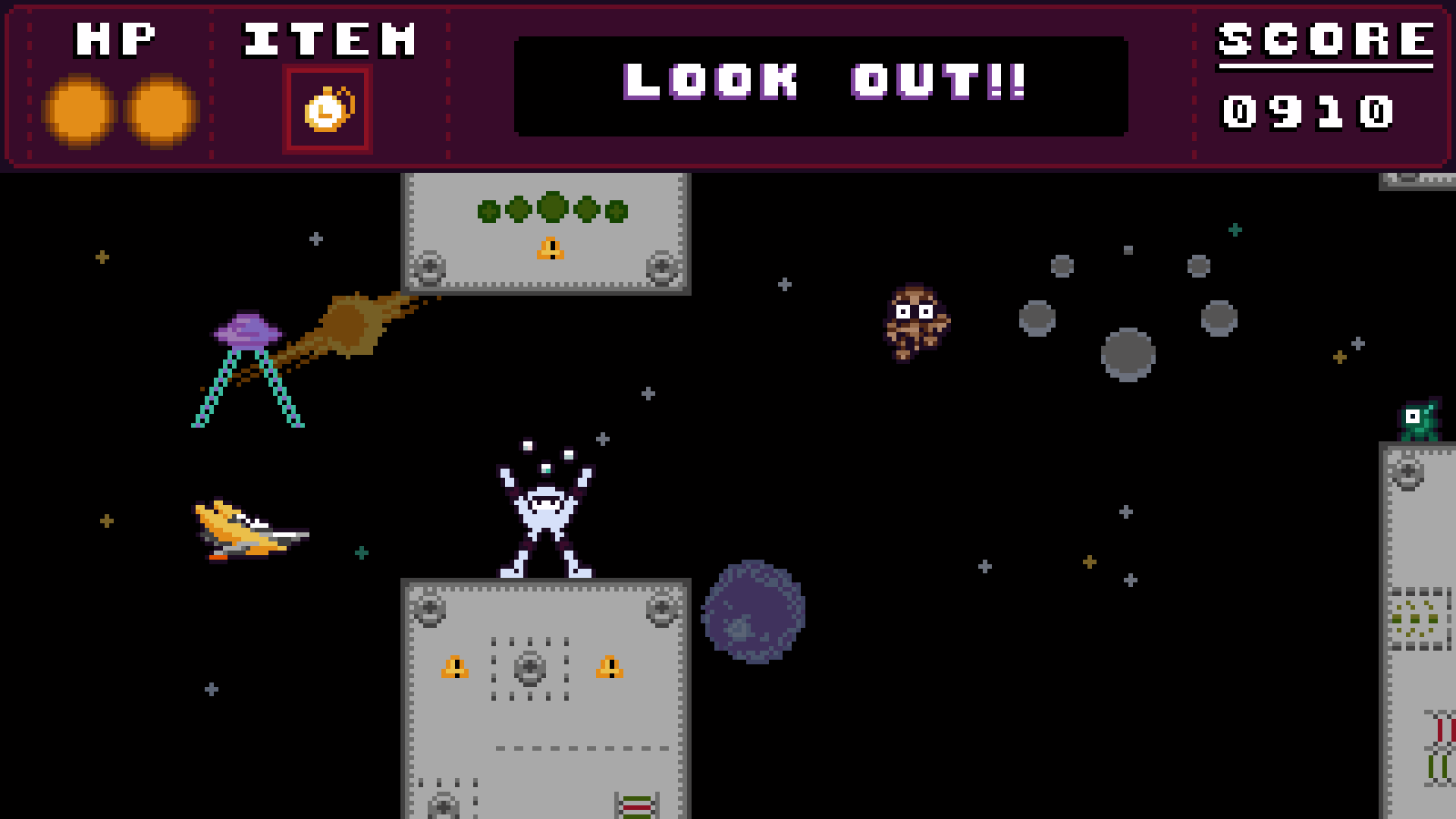you are the galaxy bird. your mission is to save the galaxy from the evil aliens including wall walker, goopy dripping thing, juggler, cyclops eel and UFO. use special items like stopwatch, coffee, and bomb dart to help you along the way.
